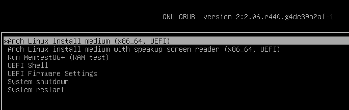 InstallationWith my settings you should be able to boot the machine. If you are using a Virtual Machine, remember to enable virtualization for your host (this is changed in the BIOS. If you don't know what any of this means just search “Enable virtualization” on the Internet and follow the steps there). If you are using a physical computer, you should only care about meeting the requirements listed above (and having a UEFI-compatible device, which in the current year shouldn't be a problem unless you're using a refurbished old system). If your settings are correct, after loading whatever media you have with the Arch ISO you should see something like this: