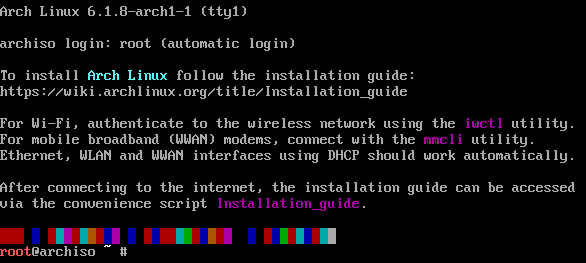 In the case the directory doesn't exist but you know your PC is using UEFI, make sure you booted in UEFI mode. Okay, we are now ready to install Arch. However, we are not going to use the standard method. Instead, we are going to use a command line utility that was created to speed-up and ease the installation of Arch Linux without needing to manually set everything up by yourself. For this, run: