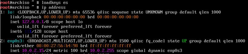 Note: From now one you'll see commands, you have to enter what's after the "#". Let's load our keyboard layout, the default one is the US keyboard. In my case, I'll use the Spanish layout “es”, for this enter the command: