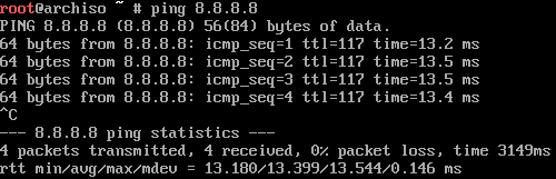 If you don't get a response (e.g. it says that the request timed out or the host is unreachable), double-check your interface and IP, try to ping another site etc. Using WiFi? Click hereIf you are using WiFi, use the iwd utility to connect to your network. Just follow these steps: First, start the tool: