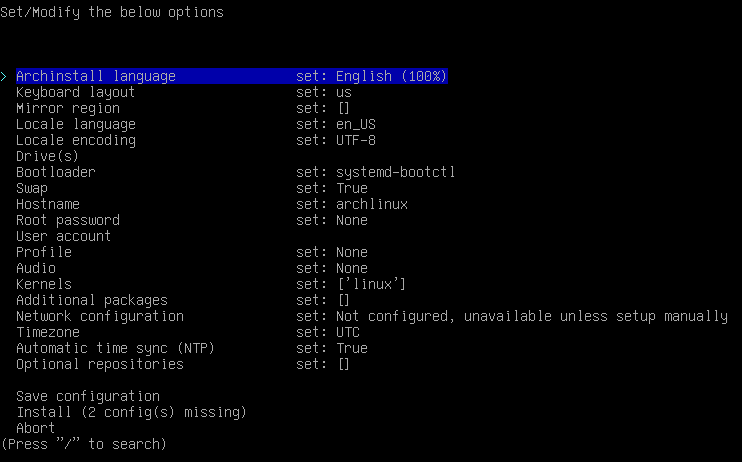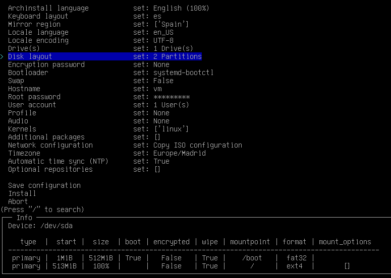 Some people might tell you are less h4x0r for taking a “shortcut”. Do not listen to them; archinstall is a command provided in the Arch base package and therefore is “as Arch” as pacman (the package manager used by Arch). Anyway, this is very easy: Simply go through each parameter and press Enter to configure. Here you have a peek of my settings: